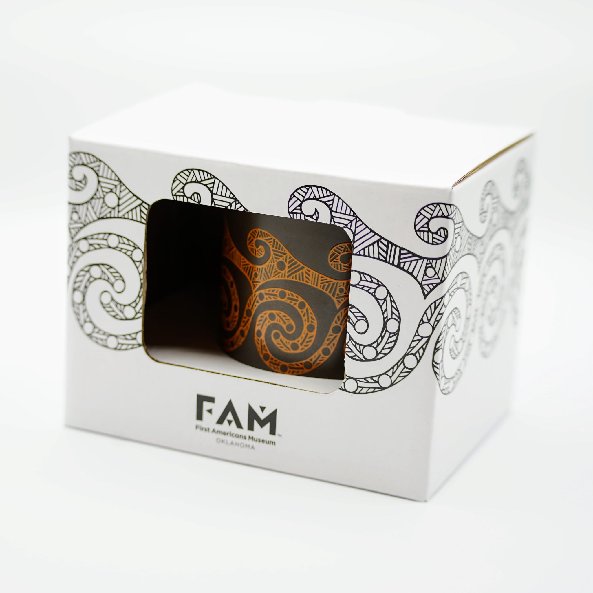 Two-toned coffee mug with the art by Jeri Redcorn (Caddo). Additional design elements on the handle. This mug comes with artwork on the box as well.